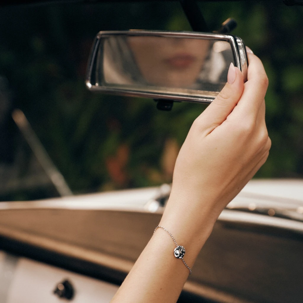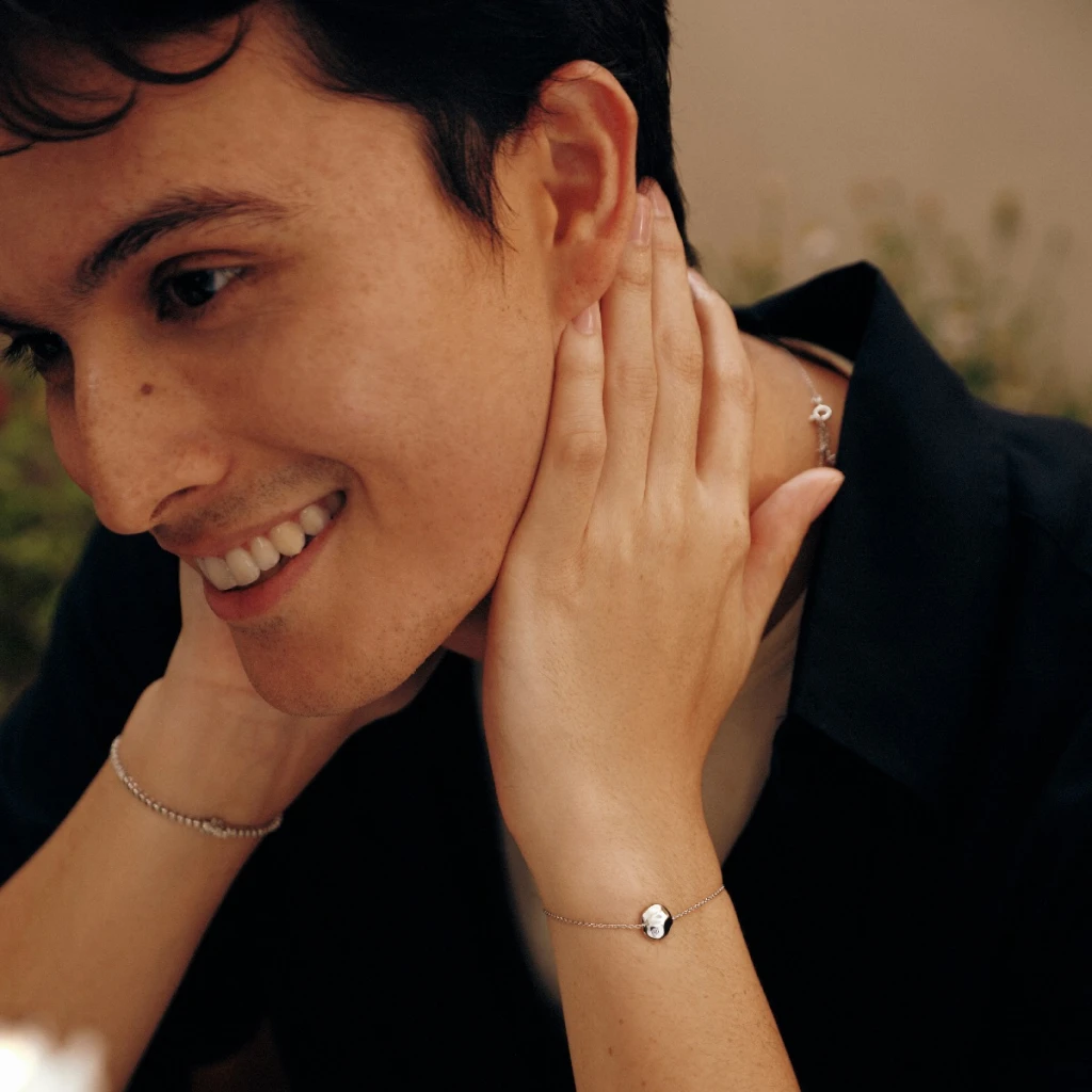 This bracelet showcases intricate wave-like details that flow seamlessly along its design. Each curve is accented with a shimmering diamond, symbolizing grace and quiet strength.