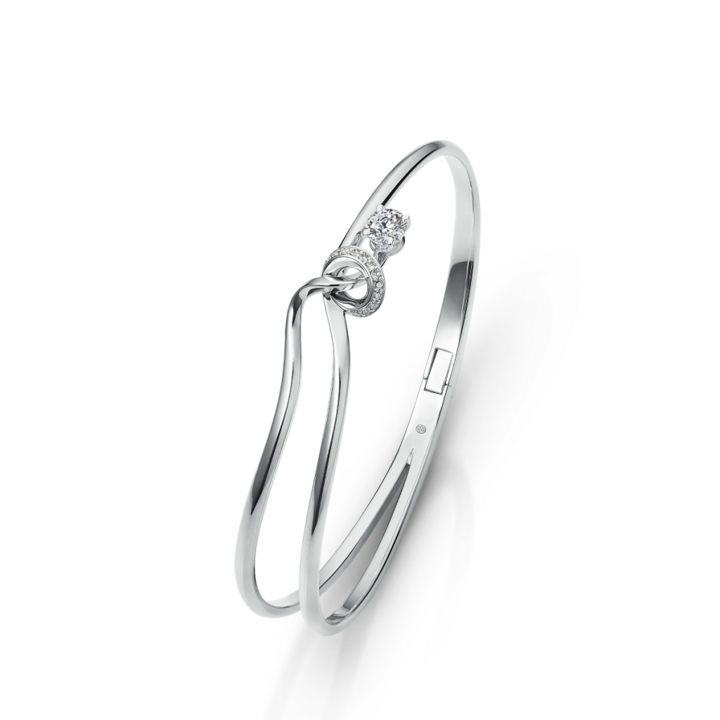 Infini Bangle with Diamond stands out with the flowing and twisted lines that embrace the 0.30-carat center diamond. The diamond details on the curves also add a classy touch to your everyday look, like wearable art.