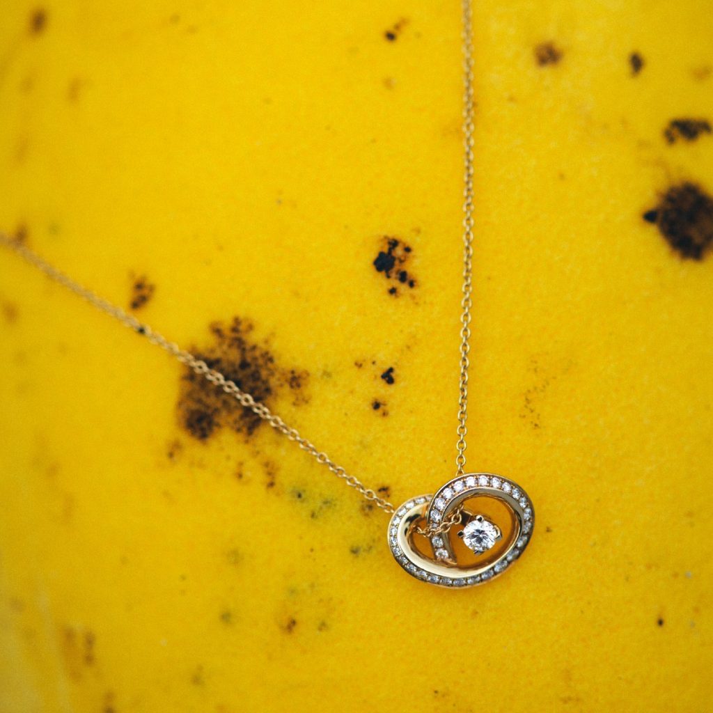 Infini Pendant with Full Diamond is a necklace with a diamond pendant with a curved line that enhances the beauty of the center diamond that comes in selectable sizes from 0.18-0.30 carat. The diamond details on its curvy part will shine elegantly on your daily look.