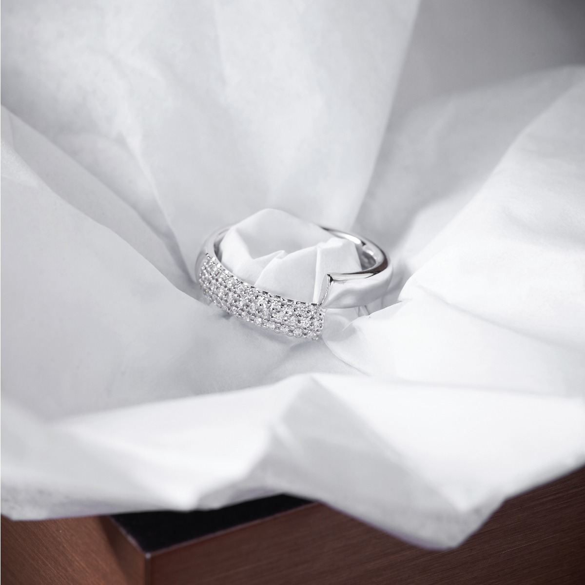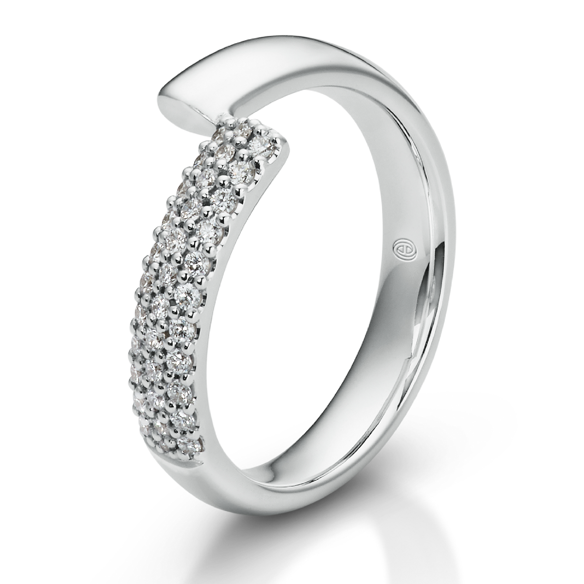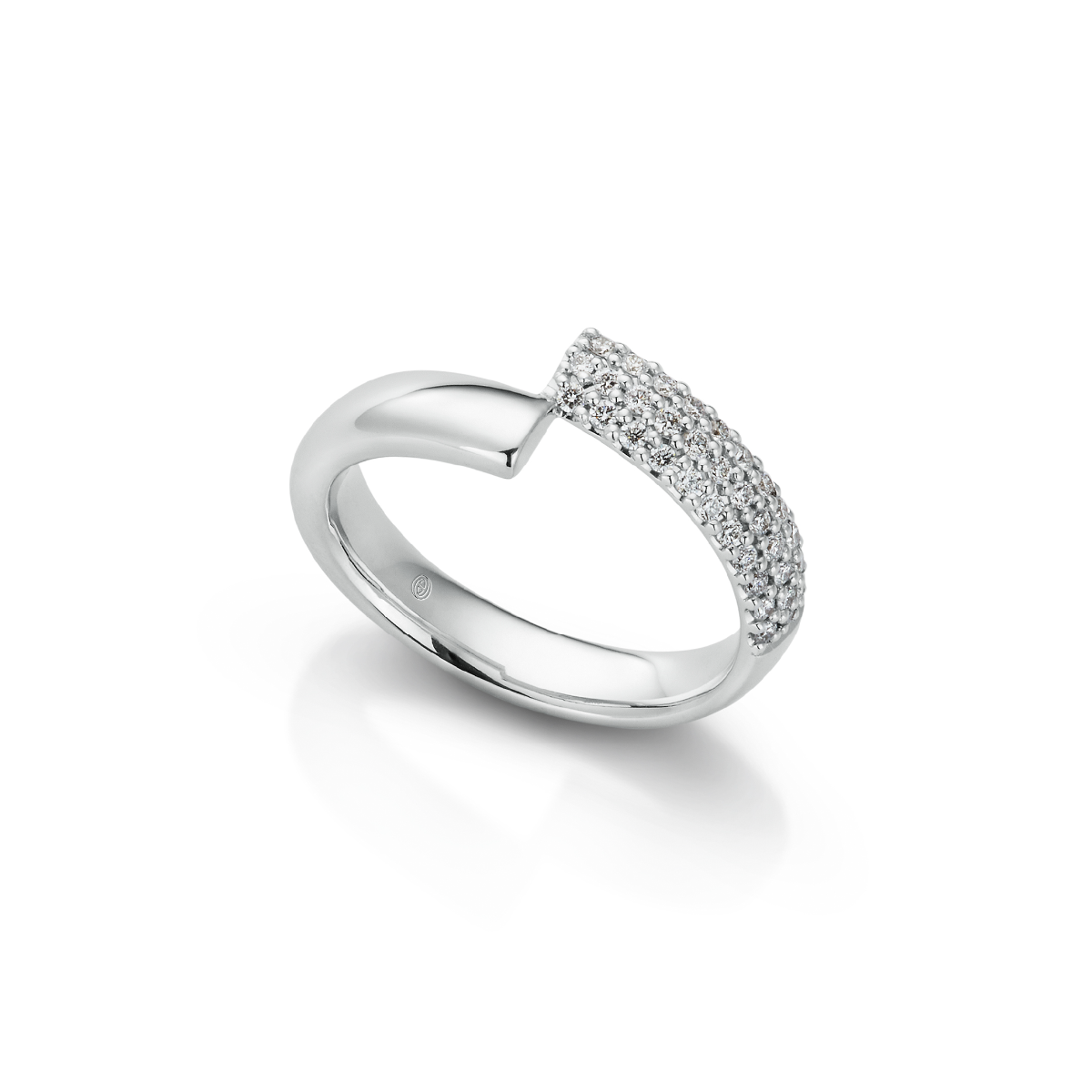 A rhythm of brilliance arcs along this expressive ring diamonds scattered like stars across its flowing silhouette. A piece that glows with passion, strength, and the elegance of meaningful design.