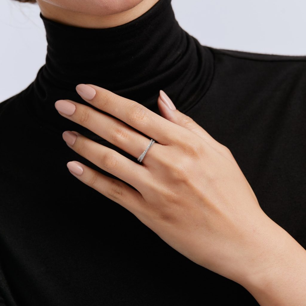 Double rows of diamonds trace a graceful X across the finger. Sculptural yet wearable, it’s made for those who favor elegance with impact.