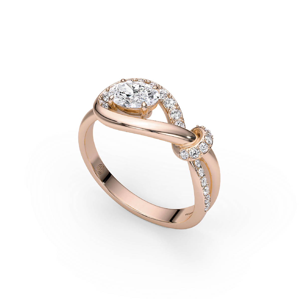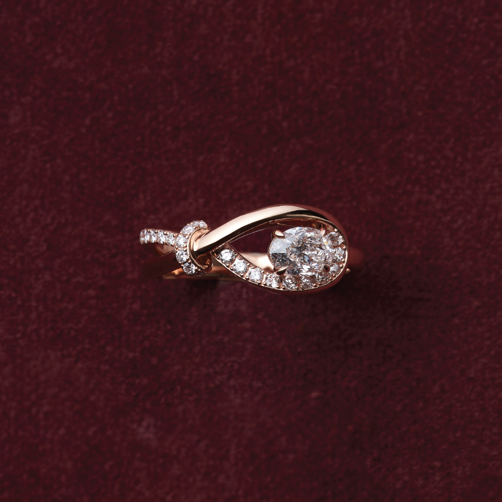 แหวน Infini Knot รุ่น Grand เพิ่มความโค้งให้ปมสานเป็นเปลประติมากรรมสำหรับเพชร การปรากฏลึกขึ้น ความชัดเจนเปล่งขึ้น และปลายนิ้วถืออำนาจอันสงบ