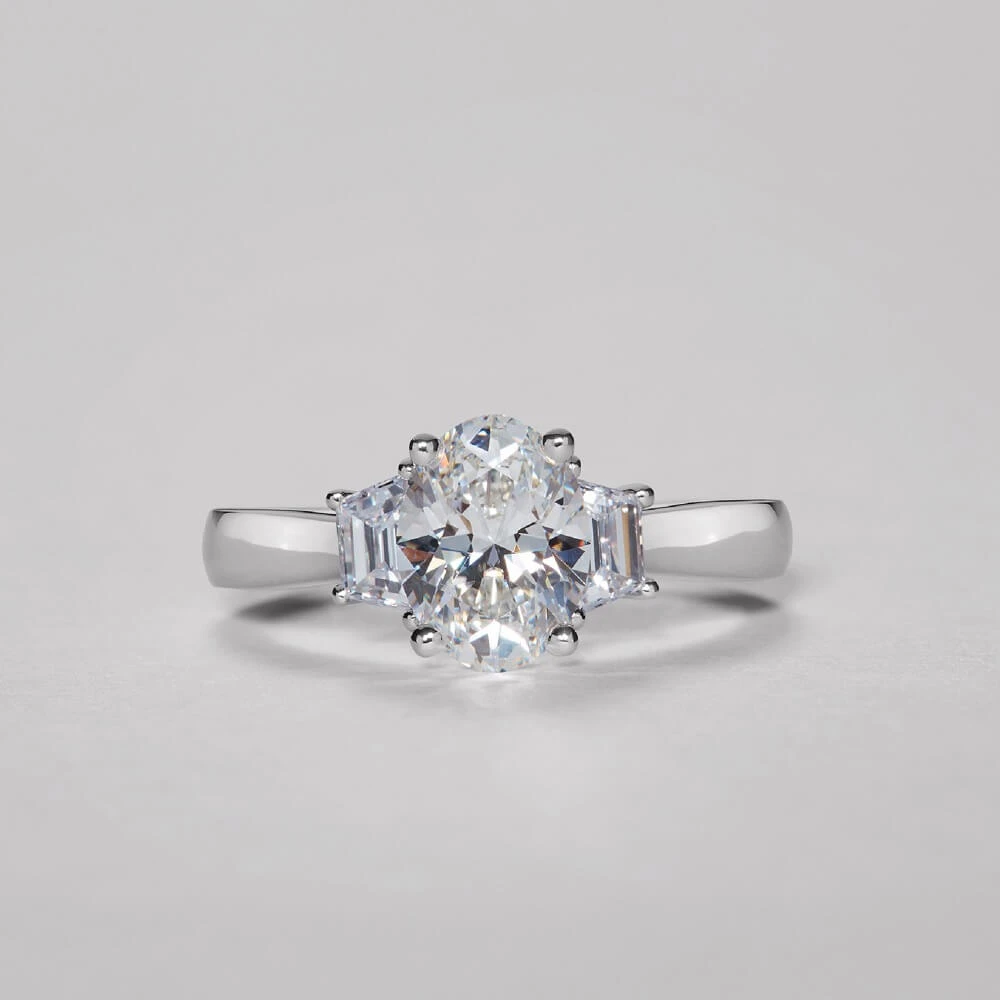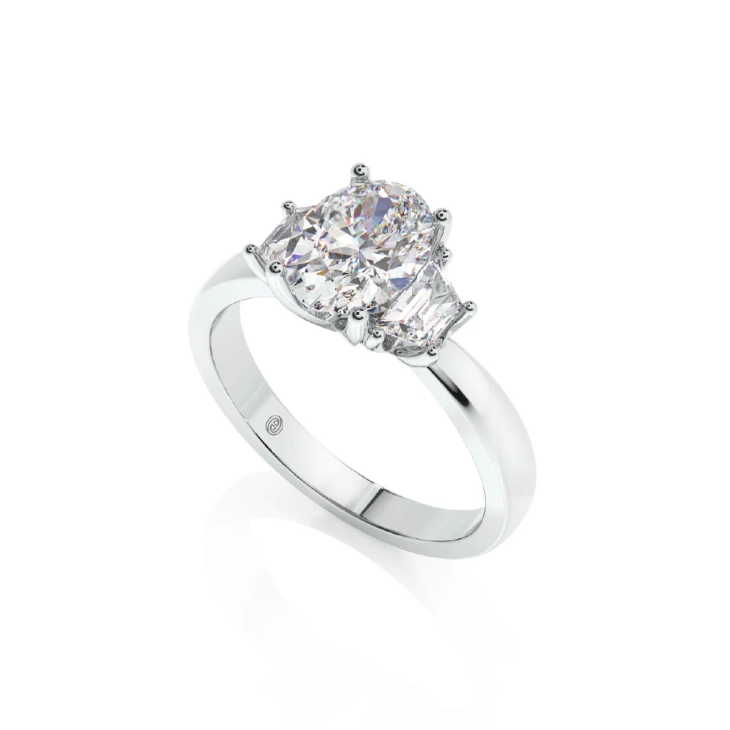 แหวนหมั้นเพชรทรงวงรีที่งดงามยิ่งขึ้นเมื่อเสริมด้วยเพชรด้านข้างสองฝั่ง ถ่ายทอดความรักที่อ่อนโยนแต่มั่นคง ดีไซน์นี้คือบทกวีของความรักที่สมดุลระหว่างความสง่างามกับความเข้มแข็ง